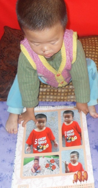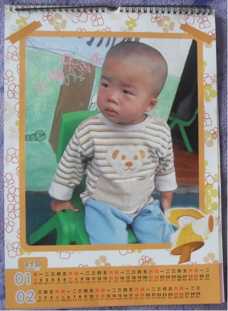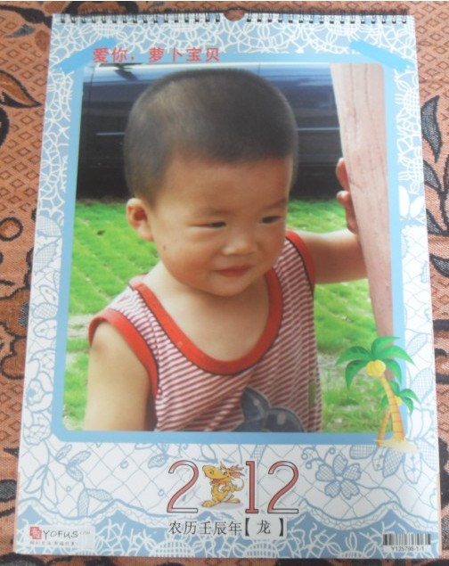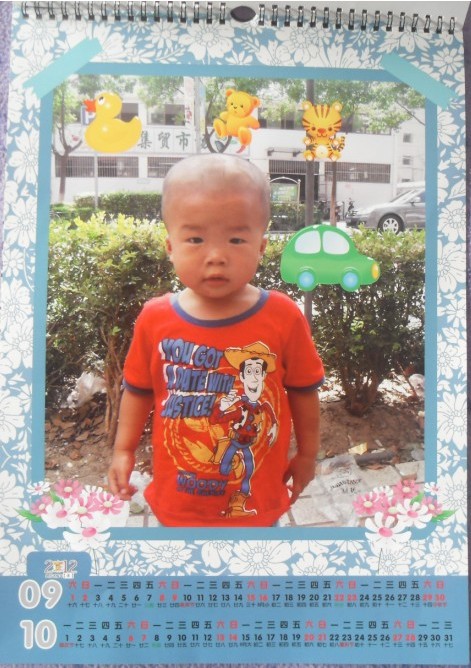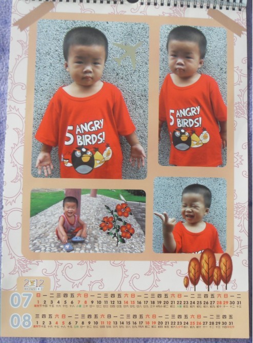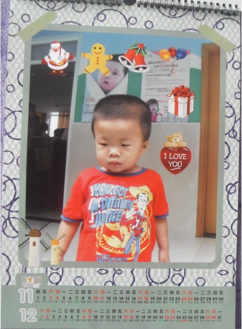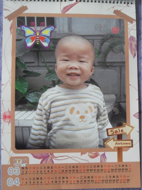 寶寶最初看到掛歷的時候,非常的開心,一下就發現了自己的倩影,指著照片說,寶寶,寶寶,有別的小朋友想看的時候,他不干,過來扯,覺得是自己的東西。后來我又給寶寶看掛歷上的掛飾,寶寶認識不少呢,笑聲不斷的爆發出來,老公也對掛歷非常的滿意,用那張4格顯眼的紅照片,掛在墻壁上,為暗淡的屋子增添了很多色彩呢。