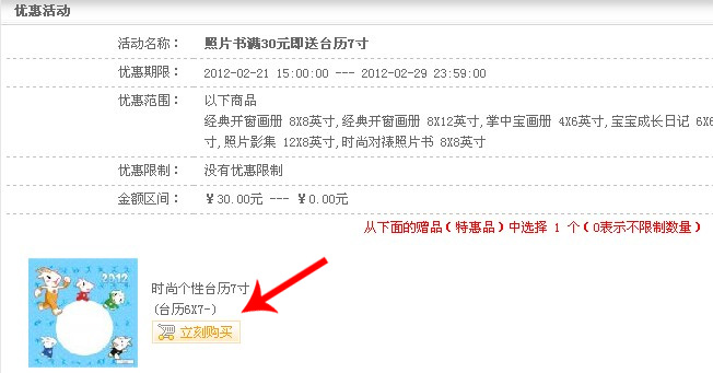 3、制作完照片書后請勿急于下單,繼續制作時尚個性臺歷7寸,制作完成后即可對照片書進行下單,然后在優惠活動中對剛剛制作好的臺歷7寸選擇立刻購買(如下圖),即可0元得臺歷!