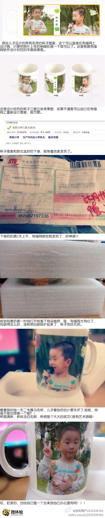 9月開學(xué)了,兒子回家說老師讓他們每人帶個杯子去學(xué)校用于喝水,湊巧康Q育兒論壇里正在開展有福網(wǎng)DIY馬克杯體驗活動,于是在12日下午報名,13號有福網(wǎng)已給我發(fā)貨,到了17號一上班就拿到了盼望已久的個性馬克杯,實在開心,這禮拜兒子就可以帶著屬于自己的杯子去學(xué)校了。