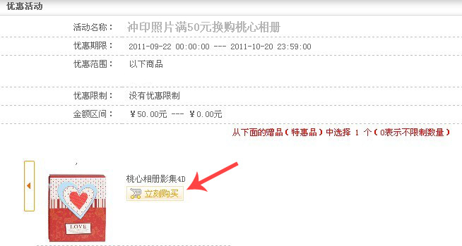 3、上傳照片后放入購物車,在優惠活動中選擇立刻購買(如下圖),即可5元得相冊!