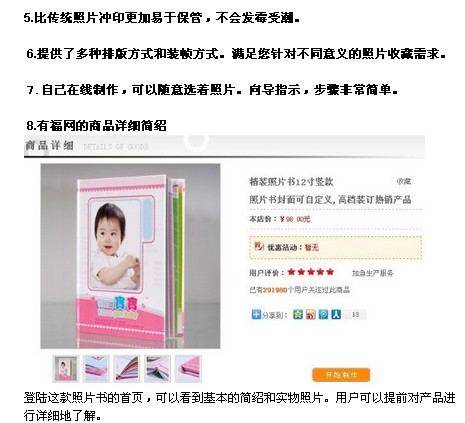 照片書搶購,我非常的高興,寶寶的那些美麗的瞬間就可以永遠保留下來了。在對有福網照片書總體了解下,覺得很不錯。“這款照片書尺寸夠大,樣式大方美麗,是我心儀已久的產品,寶寶成長的每一個月我都用相機記錄下來了,希望能有試用的機會,把寶貝可愛的照片做出來呢,留一份美好的記憶。”