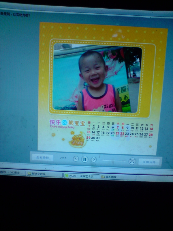 選了一個自己喜歡的小熊臺歷模板,把兩個兒子的照片一張張放進去,然后調整大小,高低,不得不說的是,這個制作軟件真的很人性化,添加照片的時候,可以把整個文件夾的照片自動添加進去,然后根據自己的喜好來選擇寶寶的照片,還有就是,照片放進去以后,如果你的照片像素低,他也會告訴你,說像素低,呵呵,包括照片添加好以后,人家按照一定的比例裁減,你也可以根據裁減的比例來調整照片的大小,很方便哦·!