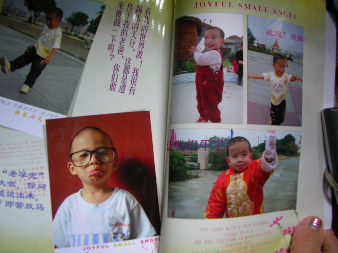 那天,她來我們辦公室上傳她已完成的照片書,一開始她就在那大呼小叫的,把我的注意力都吸引過去了,一看她兒子的照片書,哇,不得了,好可愛啊!那照片書有不同的模式,可以加上不同的裝飾,最重要的是,自己挑的照片還可以加上自己寫的文字,這正合我的胃口,我早就想做一本這樣的照片書,從兒子一出生到現在我都不知道給他照了多少相片,有一些特別點相片我就想給他寫上個說明,讓他長大了還可以回味一下,但是在我們這個地方一般都沒有這種服務的,這下可好了,我可以實現我的夢想了。