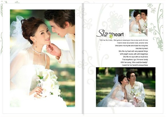 沒有花很多錢,通過朋友的介紹,來到了有福網,選擇影樓畫冊,然后下載有福藝術家軟件,將記錄咱倆在婚禮上每個鏡頭的照片一一編輯,制作了一本屬于我和老公獨一無二的婚紗影樓相冊。哈哈,我選擇了”曼妙碎花“的風格,淡雅高貴,和影樓幾千塊的相冊好不遜色。哈哈,超級喜歡哦!