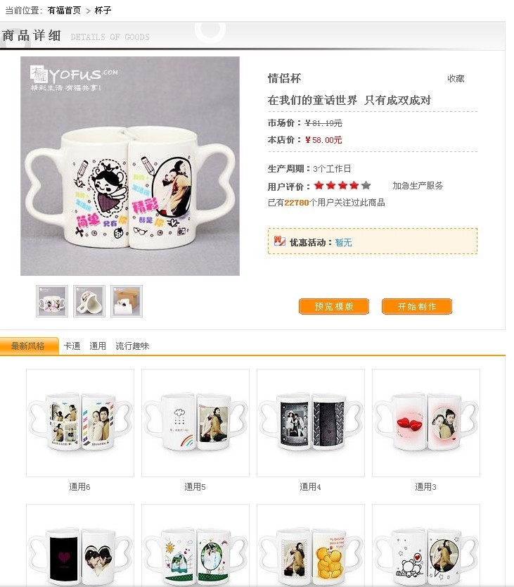 9月22日我特地上有福網(wǎng)花了打幾個小時時間終于定做完成了屬于我和老公一家的個性杯子。不過過程對于我這個辦事效率很拖拉,理解能力很差的人來說真是個不小的挑戰(zhàn)。不過全程中我和客服電話聯(lián)系了將近5次吧,那位客服人員說話很細膩,態(tài)度很溫和,我很喜歡,贊一個。以下是過程: