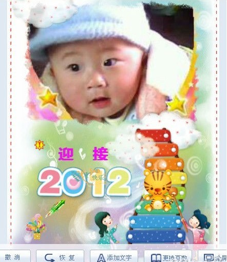 這是封面,我在2012的上方添加文字添加了迎接兩字,并以花籃代替煙花、“火箭”表示放出的煙花來迎接新的一年——2012,寶寶屬于虎的,我便從頁面修飾卡通中找來小虎并拖到臺階上,寓意寶寶親自來迎接新的一年,現在2011年還有幾個月便留了幾個臺階,還在2012上放了成長快樂表示我的愿望,希望寶寶在新的一年里健康快樂地成長!